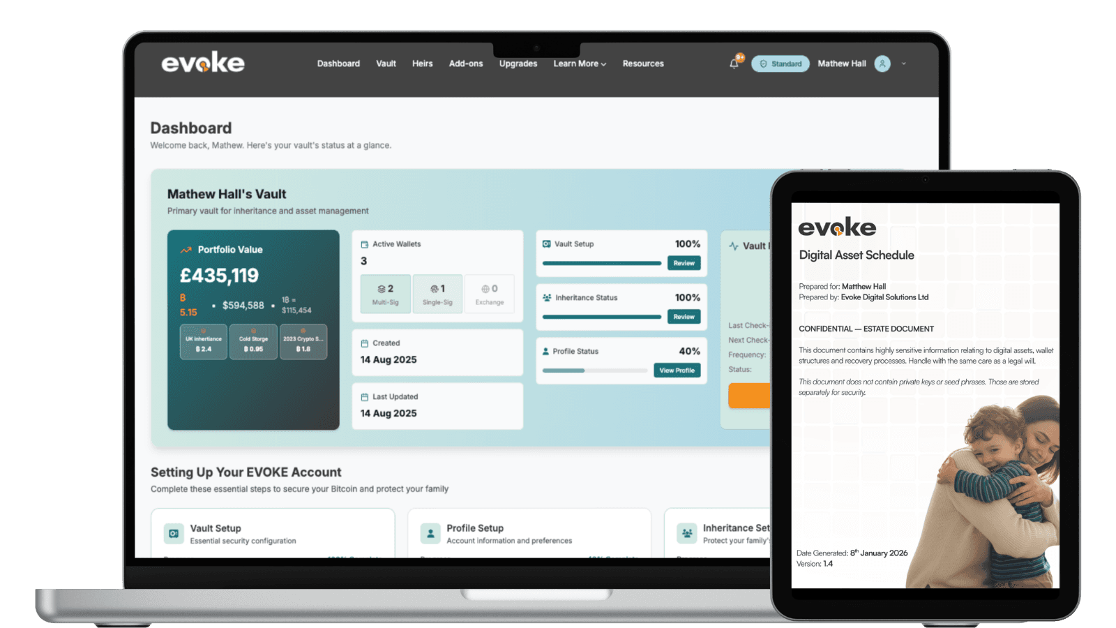 Map your wallets, assign heirs, configure alerts. Get a solicitor-ready schedule your family can actually use.